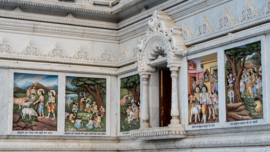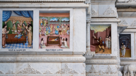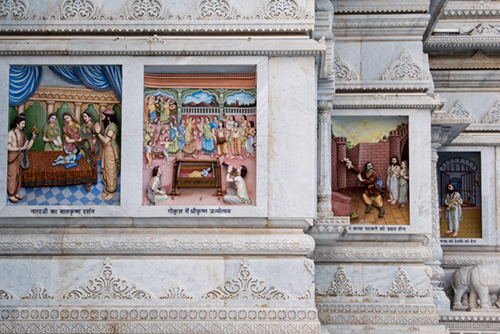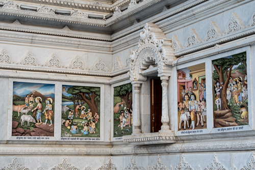 • A circumambulation route has been constructed on the mandir prāṅgaṇ, the platform of the temple, enabling visitors to view the 84 panels depicting the loving pastimes of Shri Radha Krishna which are carved on the outer walls of the temple.